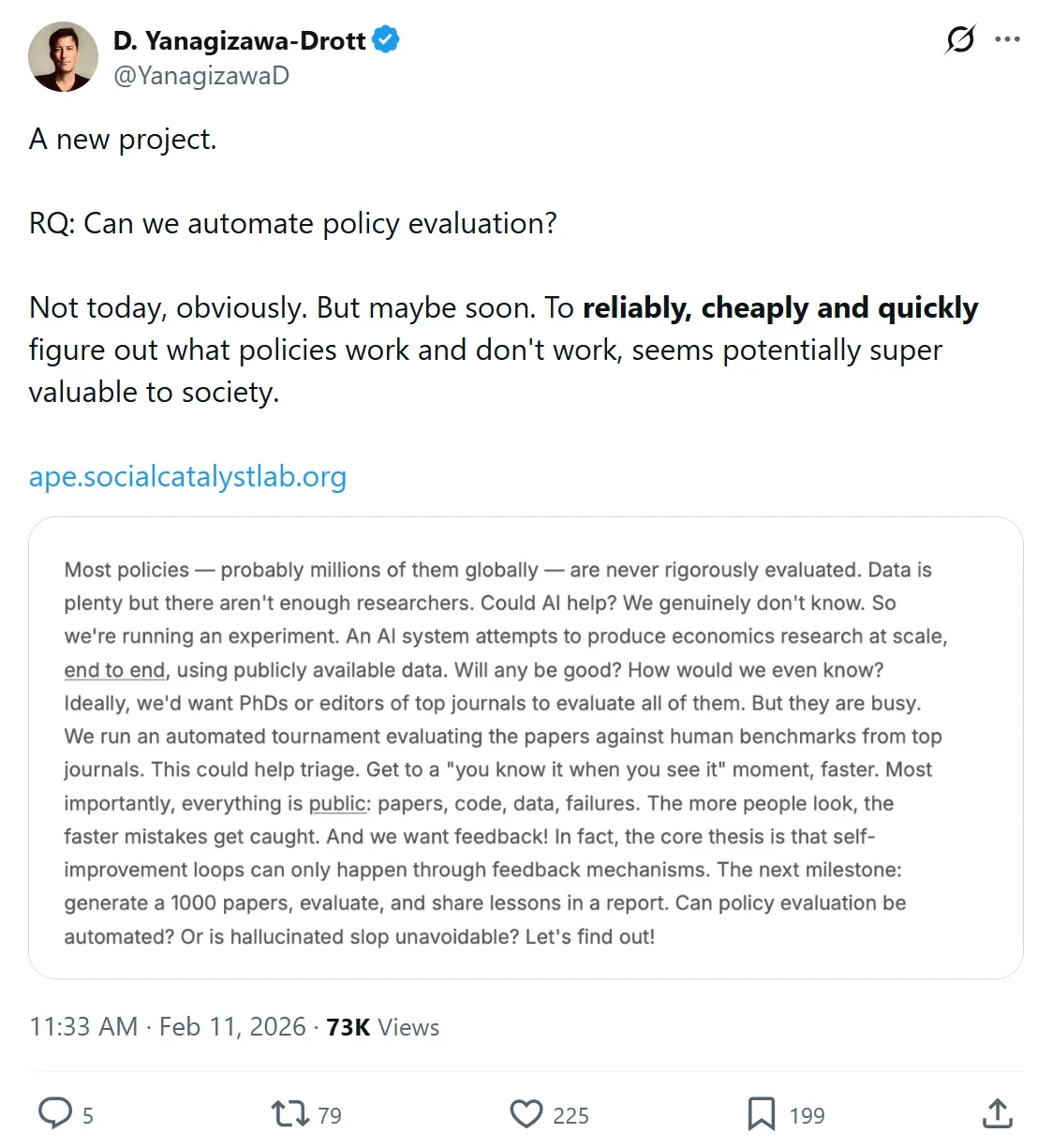 On Twitter/X and LinkedIn, there has been a large discussion of the ability to “one-shot” policy evaluation, which David Yanagizawa-Drott has been pursuing in an interesting way: ape.socialcatalystlab.org